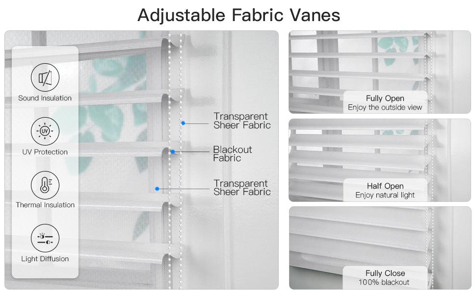 Shangri-La shade features soft fabric vanes and sheer panels. It filters light gently, blocks glare, protects from UV, and offers adjustable privacy. Vane angle can be adjusted only when fully lowered.