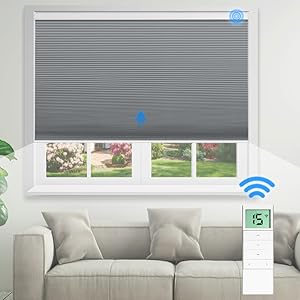 Crafted from 100% blackout fabric, these motorized cellular shades create a fully darkened environment. The unique honeycomb-shaped fabric cells expand and contract as you raise or lower the shade, offering energy efficiency, noise reduction, UV protection, and enhanced privacy. The cordless design ensures a safe environment for children and pets. Ideal for living rooms, bedrooms, kids' rooms, home offices, media rooms, and offices. For indoor use only.