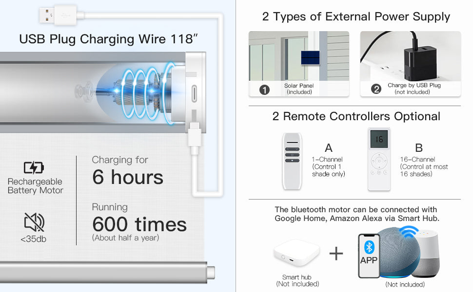 Smart Motor: Built-in rechargeable Bluetooth battery motor runs for months on a full charge. Paired with a solar panel, it eliminates charging concerns. Connect via Bluetooth to the app, or integrate with Alexa/Google Assistant using a compatible hub/bridge.