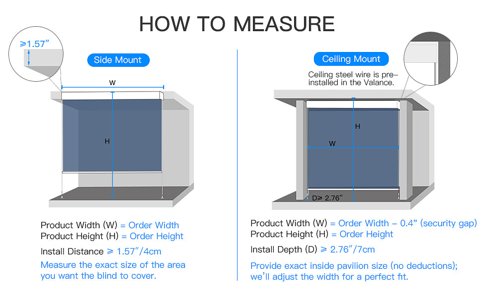- Ceiling/Inside Mount: Requires a minimum frame depth of 2.76". Leave a 0.78" gap on both sides for wire guide bracket installation.