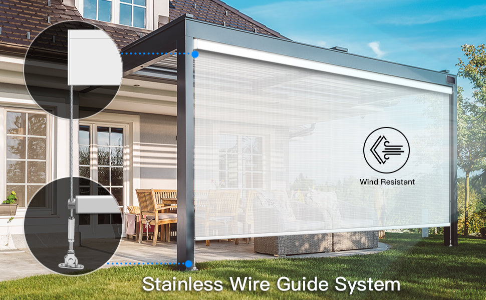 Wind-Resistant Design: The motorized shade is equipped with a stainless steel wire guide system that helps prevent swaying or blowing in the wind—perfect for outdoor environments.