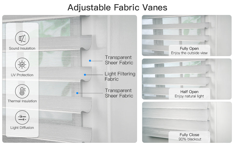 Crafted with 90% blackout fabric, the Shangri-La shade combines soft S-shaped fabric vanes with light-diffusing sheer panels. The sheer layers offer a gentle outside view, while the adjustable vanes provide flexible light control and daytime privacy—allowing natural light in without harsh glare. This shade also offers UV protection and a clean cordless design, making it safe for homes with children or pets. Ideal for living rooms, bedrooms, offices, and other indoor spaces.