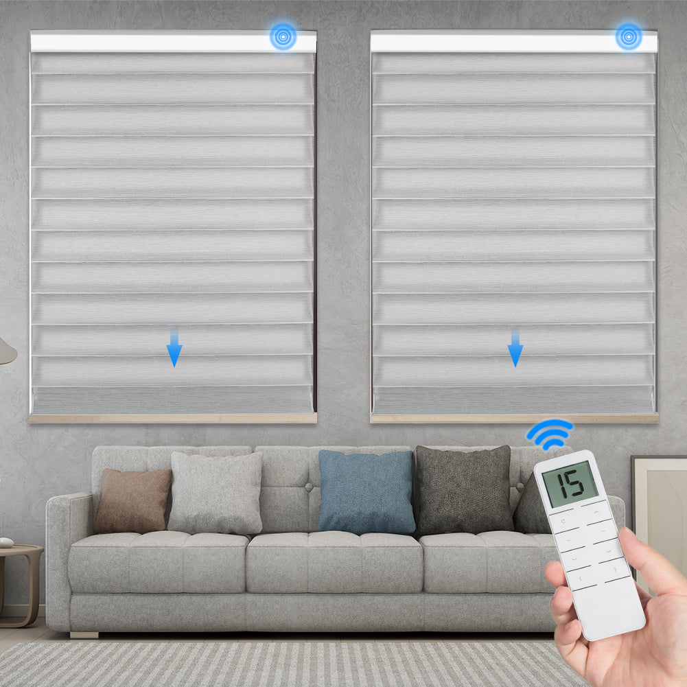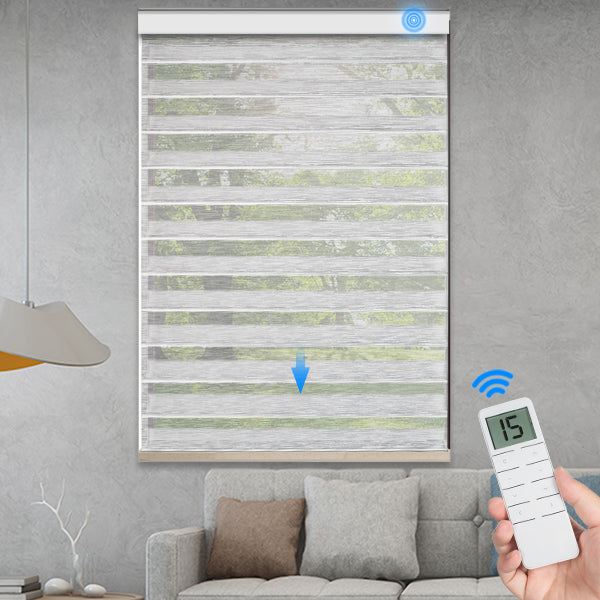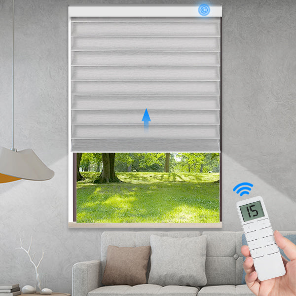 Tokblind motorized Shangri-La sheer shades let you control light with ease. Raise or lower the shade with a simple click on the remote. For voice, app, or timer control, connect to Alexa or Google Assistant via an RF hub.