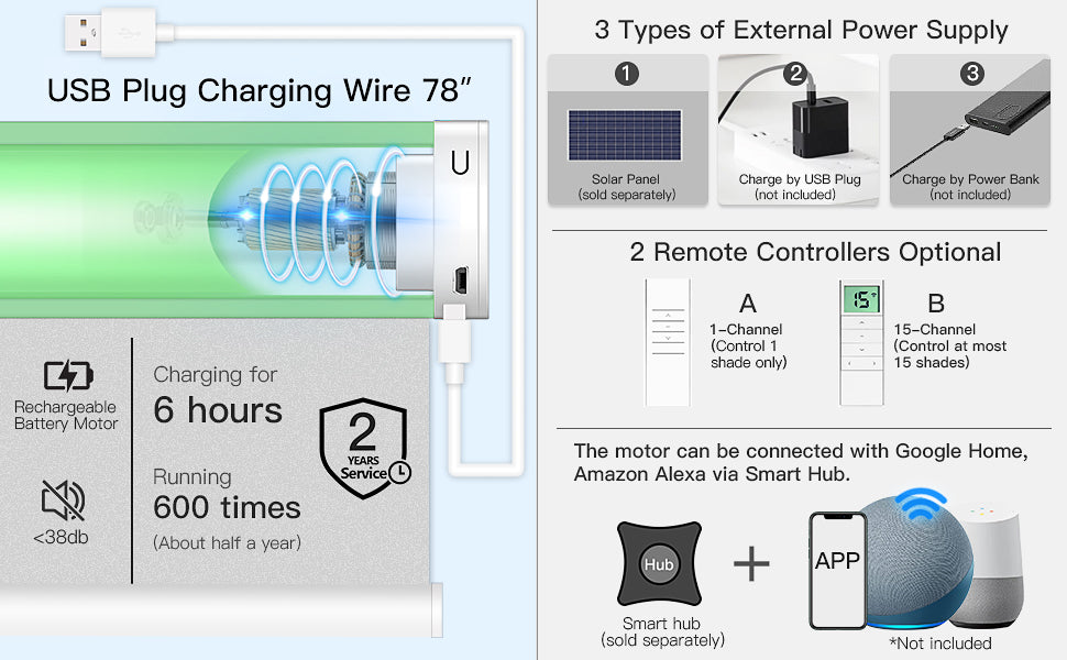 The motor will be programmed well before shipping. You can use the remote to control it directly after installation. It needs an RF hub to connect to Alexa and Google Assistant. Adding a solar panel can solve the charging problem if the window is high or far from the socket. 1 solar panel can work with 1 smart blind only.